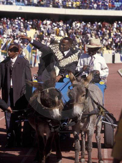 Personality Traditional leaders. Kgosi Leruo Tshekedi Molotlegi, 36th King of the Bafokeng Kingdom, rides in a donkey cart during his enthronement at the Royal Bafokeng Sport Stadium - 2003